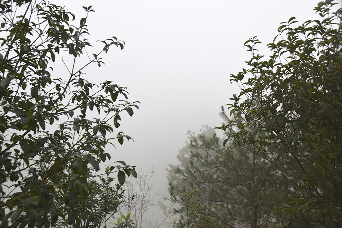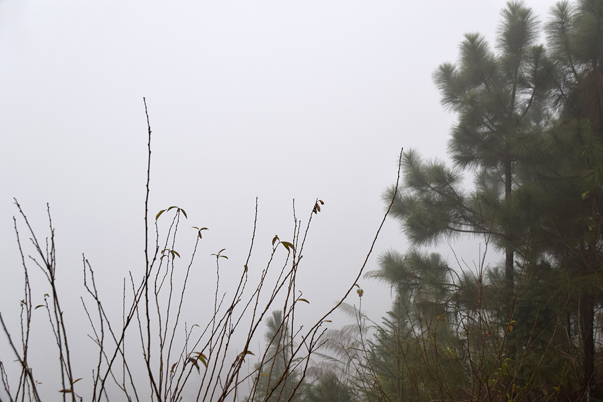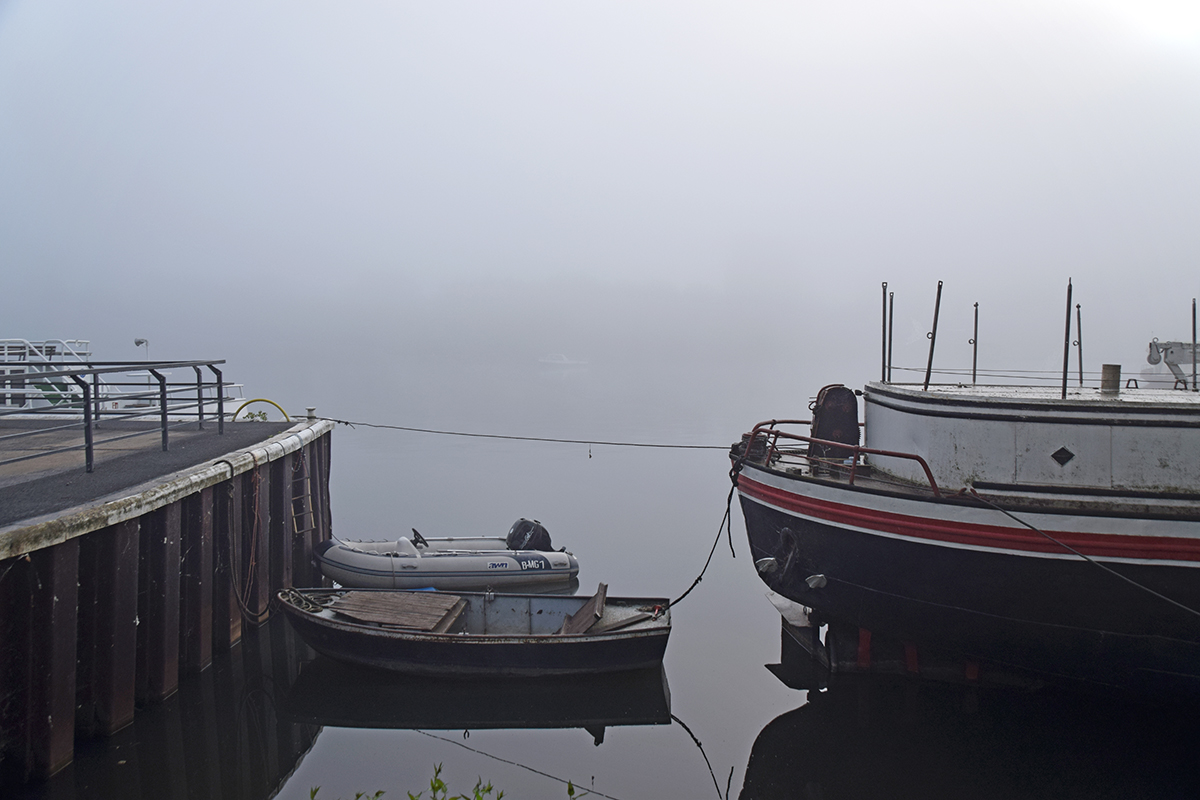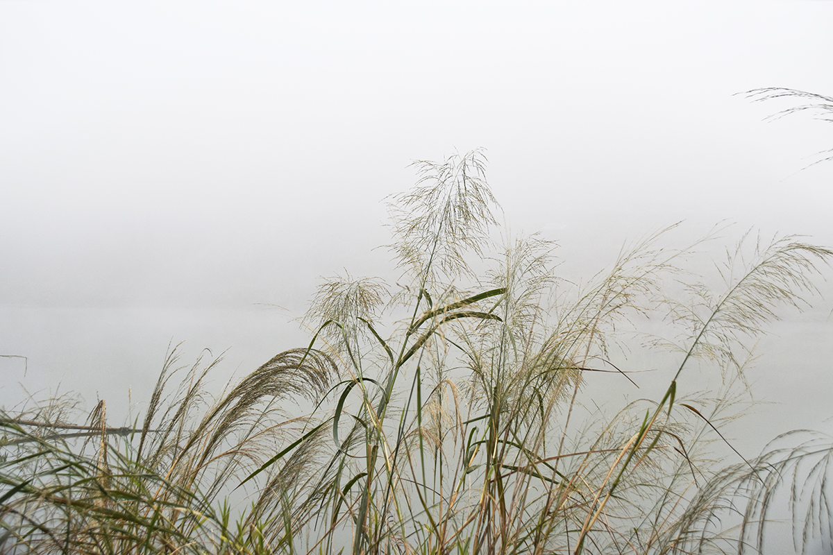 Fog over the lake. No view into the distance, the other shore a blue-gray nothingness. How much closer the near comes when the far is missing.